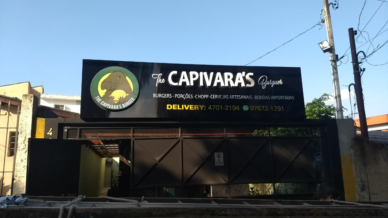 Placa em ACM, logotipo em chapa galvanizada com pintura automotiva e informações em adesivo com recorte eletrônico. Trabalho realizado na região de Taboão da Serra , na hamburgueria Capivara’s burguer
