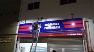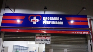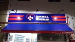 Placa em ACM com letreiro em alto relevo, Toldo retratil e iluminação em Holofotes Trabalho realizado na Drogaria e perfumaria M&D, localizado na Rodovia Reggis Bitencourt